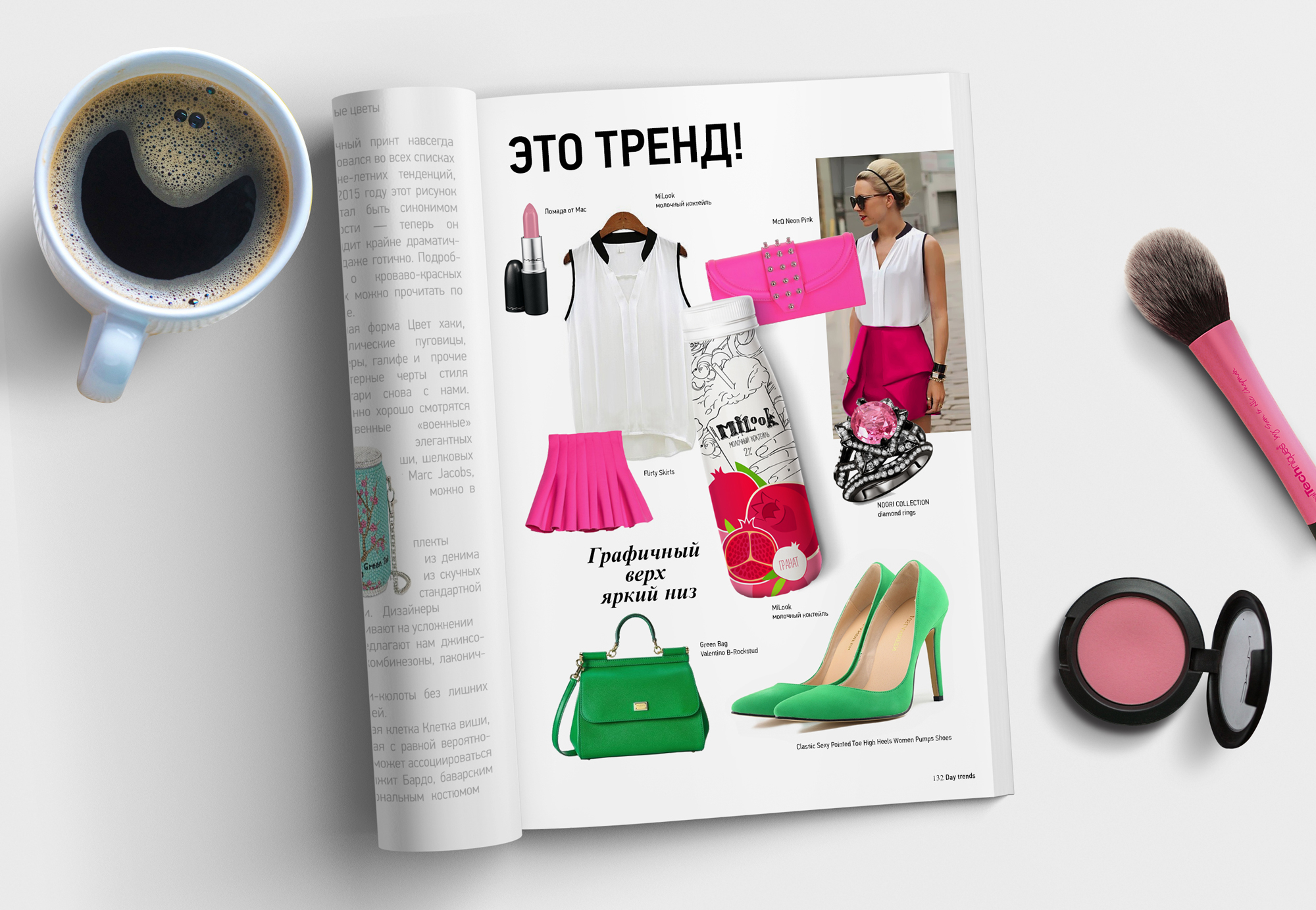Печатная реклама выполнена так, чтобы и вовсе не выглядеть рекламой. В модных журналах, которые любит целевая аудитория, часто можно встретить разделы «тенденции», «маст-хэв», «тренды». Макет оформлен по аналогии с ними. Таким образом, он кажется частью журнала, что сразу поднимает ценность информации в глазах читательницы. На основе дизайна продукта мы создаем цельный образ для молодой девушки, эффектно вписывая продукт в ее повседневность, где он становится не просто молочным коктейлем, а настоящим аксессуаром.